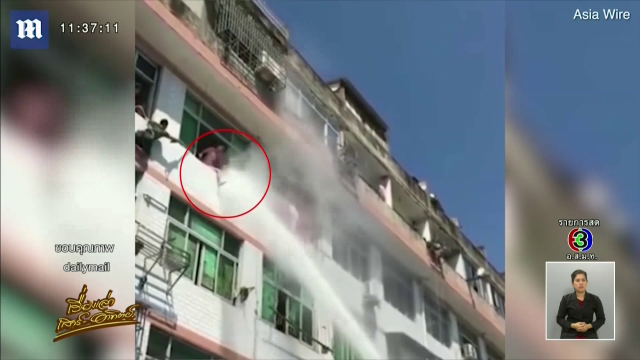 คลิปสาวจีนจะกระโดดตึกฆ่าตัวตาย โดนกู้ภัยฉีดน้ำใส่ ร่างกระเด็นกลับเข้าไปในอาคาร