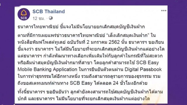 ตามที่มีการเผยแพร่ข่าวธนาคารไทยพาณิชย์ “เล็งเลิกสมุดเงินฝาก” ในหนังสือพิมพ์โพสต์ทูเดย์ ฉบับวันที่ 2 มกราคม2562 นั้น ธนาคารฯ ขอเรียนชี้แจงว่า ธนาคารฯ ไม่ได้มีนโยบายที่จะยกเลิกสมุดบัญชีเงินฝากแต่อย่างใด แต่ธนาคารฯ กำลังพัฒนาทางเลือกเพิ่มเติมให้กับลูกค้าในกรณีที่ไม่สะดวกหรือลืมนำสมุดบัญชีเงินฝากมาที่สาขา