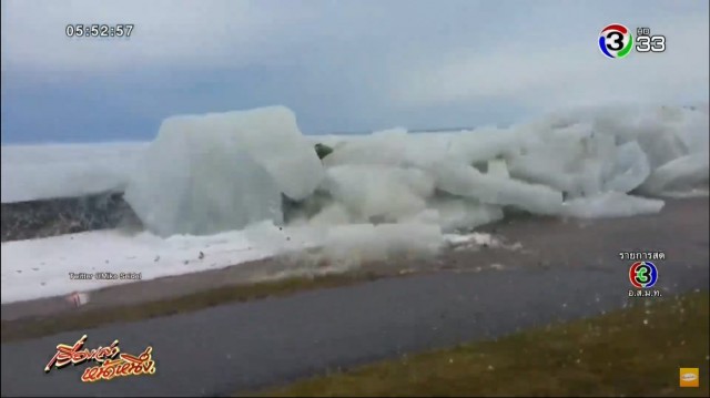 สหรัฐฯ - เป็นปรากฏการณ์สึนามิน้ำแข็ง หรือที่มีชื่อเรียกอย่างเป็นทางการว่า ลมผลักน้ำแข็ง เกิดขึ้นเมื่อมีคลื่น ประกอบกับลมกระโชกแรง หรืออุณหภูมิเปลี่ยนแปลง ทำให้ก้อนน้ำแข็งซัดขึ้นมาบนฝั่ง ในคลิปเกิดขณะมีความเร็วลม 119 กิโลเมตรต่อชั่วโมง ทำให้กำแพงน้ำแข็งสูง 9 เมตร เกยขึ้นมาบนฝั่งทะเลสาบอีรี ทำให้แผ่นน้ำแข็งกระเพื่อมขึ้นๆ ลงๆ ได้เอง