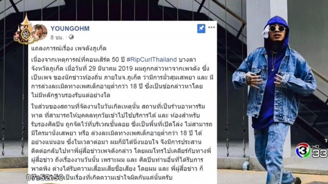 แถลงการณ์เรื่อง เพจดังภูเก็ต เนื่องจากเหตุการณ์ที่คอนเสิร์ต 50 ปี #RipCurlThailand บางลา จังหวัดภูเก็ต เมื่อวันที่ 29 มีนาคม 2019 ผมถูกกล่าวหาจากเพจดัง ซึ่งเป็นเพจ ของนักข่าวท้องถิ่น ภายใน จ.ภูเก็ต ว่ามีการมั่วสุมเสพยา และ มีการล่วงละเมิดทางเพศเด็กอายุต่ำกว่า 18 ปี ซึ่งเป็นข้อกล่าวหาโดยไม่มีหลักฐานรองรับแต่อย่างใด