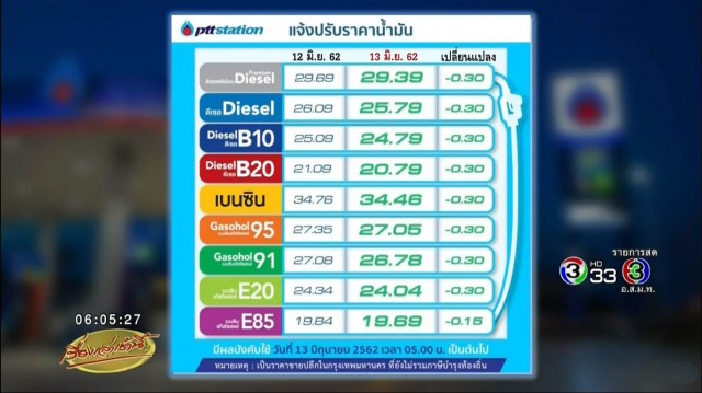 ขณะที่ราคาน้ำมันในไทย มีการประกาศปรับลดราคาน้ำมันกลุ่มแก๊สโซฮอล์ลง 0.30 สตางค์ต่อลิตร ยกเว้น E85 ปรับลง 0.15 สตางค์ต่อลิตร ขณะที่ดีเซล ดีเซลพรีเมี่ยม HSD-B10 และ HSD-B20 ลดลง 0.30 สตางค์ต่อลิตร มีผล 13 มิ.ย. 2562 เวลา 05.00 น. ส่งผลให้ราคาใหม่เป็นดังนี้