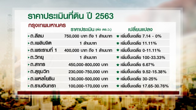 โดยราคาที่ดินในกรุงเทพฯปรับเพิ่มเฉลี่ย 2.45% โดยอัตราเปลี่ยนแปลงของราคาที่ดินถนนสายสำคัญ ซึ่งคิดเป็นตารางวา (ตร.ว.) ได้แก่
