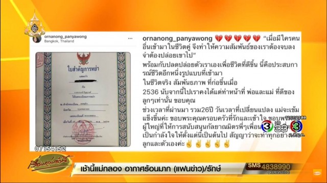 โดยได้โพสต์รูปใบหย่า ลงวันที่ 15 กรกฎาคม 2562 ซึ่งได้ทำการหย่า ที่สำนักงานเขตจตุจักร พร้อมข้อความบอกว่า