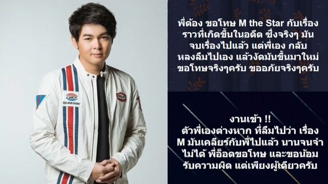 "พี่ต้องขอโทษ M The Star กับเรื่องราวที่เกิดขึ้นในอดีต ซึ่งจริงๆมันจบเรื่องไปแล้ว แต่พี่เองกลับหลงลืมไปเอง แล้วงัดมันขึ้นมาใหม่ ขอโทษริงๆครับ ขออภัยจริงๆครับ"
