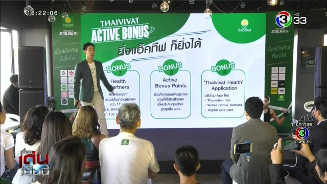 ต่อยอดความสำเร็จนวัตกรรมประกันภัยจากประกันรถ เปิด-ปิด สู่ประกันสุขภาพ Thaivivat Active Health ยิ่งออกกำลังกาย เบี้ยยิ่งลด สูงสุดถึง 40% โดยใช้ Wearable เทคโนโลยี พร้อมจับมือกับแบรนด์สุขภาพชั้นนำ มอบสิทธิประโยชน์ให้แก่ลูกค้าประกันสุขภาพแบบ Exclusive ทั้งเรื่องอาหาร การออกกำลังกาย และกิจกรรมด้านสุขภาพที่จะจัดขึ้นตลอดทั้งปี ผ่านแคมเปญ “ Active Bonus ยิ่ง ACTIVE ก็ยิ่งได้” พร้อมดึงพรีเซนเตอร์ อาเล็ก ธีรเดช เปิดมุมมองด้านสุขภาพ เชิญชวนคนไทยหันมาดูแลสุขภาพที่ดีในทุกมิติ