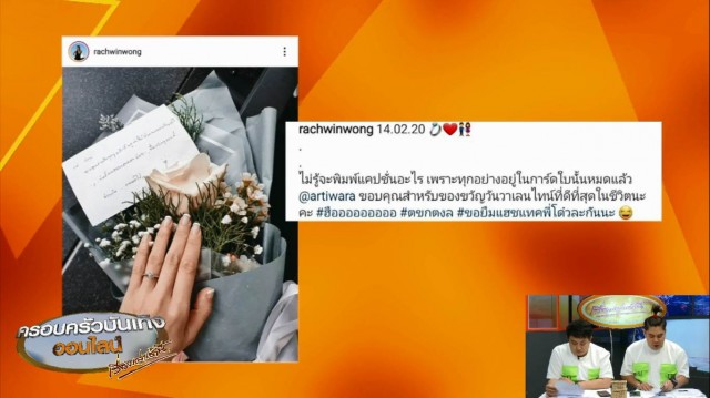 หลังจากนั้น ‘ก้อย’ ก็โพสต์ภาพแหวนที่นิ้วนาง พร้อมช่อดอกไม้และการ์ดที่ ‘พี่ตูน’ มอบให้ พร้อมเขียนแคปชั่นบอกว่า