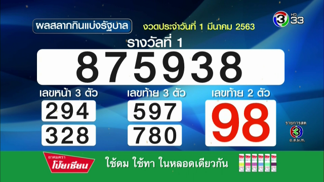 ผลสลากกินแบ่งรัฐบาล งวดวันที่ 1 มีนาคม 2563