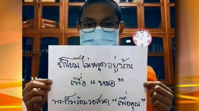 ขณะที่ในโลกออนไลน์ มีการแชร์ภาพพระภิกษุได้ออกมาโพสต์รูปพร้อมข้อเขียนด้วยเช่นกัน โดยระบุใจความว่า “ถ้าโยมไม่หยุดอยู่บ้านเพื่อหมอ พระก็พร้อมรอสวดเพื่อคุณ” เพื่อเป็นอีกหนึ่งกระบอกเสียง เรียกร้องให้ประชาชนหยุดการเดินทาง เพื่อลดความเสี่ยงการแพร่เชื้อโควิด-19