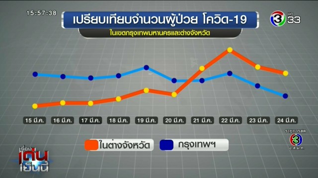 ศูนย์ปฏิบัติการฉุกเฉินด้านวิจัยและวิชาการ กระทรวงการอุดมศึกษา วิทยาศาสตร์ วิจัยและนวัตกรรม เปรียบเทียบจำนวนผู้ติดเชื้อโควิด-19 รายใหม่พบว่า ผู้ติดเชื้อในต่างจังหวัด เริ่มมากกว่าในพื้นที่ กรุงเทพมหานคร มาตั้งแต่วันที่ 21 มีนาคม แล้ว โดยยังมีกลุ่มผู้อยู่ระหว่างสอบสวนโรคอีกจำนวนหนึ่งที่ยังไม่ระบุว่าพบพื้นที่ใด ทำให้แนวโน้มของผู้ติดเชื้อในต่างจังหวัดเริ่มจะมากกว่าใน กทม.แล้ว