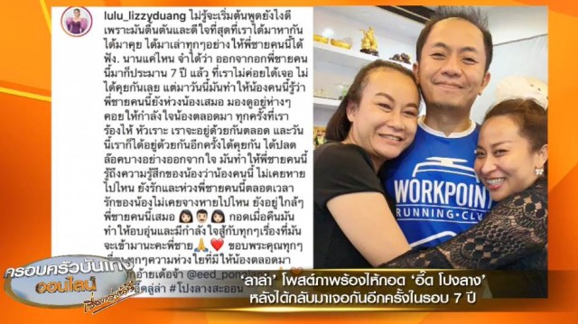 นอกจากนี้ ‘ลาล่า’ ก็ยังได้โพสต์คลิป ที่ตัวเอง กับ ‘ลูลู่’ สวมกอด ‘พี่อี๊ด’ ร้องไห้ พร้อมเขียนข้อความยาวอีกนิดนึงบอกว่า