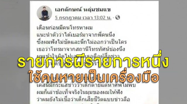 ผู้ใช้เฟซบุ๊ก เอกลักษณ์ หลุ่มชมแข หัวหน้าศูนย์ข้อมูลคนหายเพื่อการต่อต้านการค้ามนุษย์ มูลนิธิกระจกเงา ได้เปิดเผยเรื่องราว มีรายการผีโทรมาถามถึงคดีเด็กหายรายนึง ประมาณว่าจะไปทำพิธีเชิญวิญญาณมาคุย โดยระบุข้อความว่า