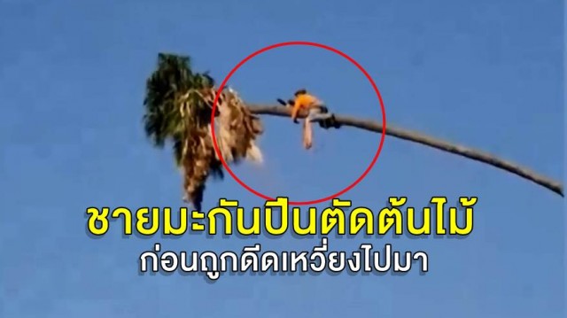 สหรัฐอเมริกา-คลิปชายชาวอเมริกัน ปีนขึ้นไปตัดยอดต้นปาล์ม ด้วยความสูงและน้ำหนัก ทำให้พอตัดยอดปาล์มออก ต้นไม้ก็ดีดโยกไปมาอย่างหวาดเสียว ชายหนุ่มต้องกอดต้นไม้เอาไว้แน่น จนเมื่อแรงเหวี่ยงลดลงถึงปีนลงมาได้อย่างปลอดภัย เหตุเกิดที่รัฐแคลิฟอร์เนีย