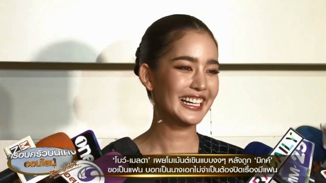 งานนี้นักข่าวยังได้ถามถึงความสัมพันธ์กับพระเอกต่างช่อง ‘มิกค์ ทองระย้า’ ที่ก่อนหน้านี้ฝ่ายชายได้ออกบอกว่าใช้คำว่าแฟนได้แล้ว ‘โบว์’ ก็ออกอาการเขินและบอกว่าก็เอาอย่างที่พี่เค้าพูดนั่นแหละ ยอมรับว่ามีโมเม้นต์ตอนที่ถูกขอเป็นแฟนเหมือนกัน ตอนนั้นก็ยอมรับว่างงๆ แต่ก็มีความโรแมนติกอยู่ แม้จะไม่ได้มีดอกไม้แต่โรแมนติกด้วยคำพูด