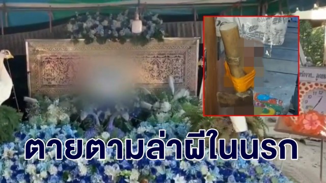 โดยขาซ้ายผู้ตายมีมีดทำครัวด้ามไม้ยาวประมาณ 1 ฟุต ผูกมัดติดอยู่ ที่ขาขวามีขวานยาวประมาณ 1 ฟุต รัดขาอยู่เช่นกัน 1 ด้าม ที่ข้างลำตัวด้านขวามีมีดดาบยาวประมาณ 3.5 ฟุต ผูกมัดติดกับลำตัว และที่ด้านหลังมีมีดแบบเดินป่า ชนิดสปาต้ายาวประมาณ 3 ฟุต เหน็บอยู่ด้านหลัง อีก 1 เล่ม ซึ่งจากการชันสูตรพลิกศพในเบื้องต้นเสียชีวิตมาแล้วไม่ต่ำกว่า 3 ชั่วโมง