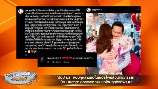 นอกจากนี้ ‘ป๊อป นิธิ’ ยังได้โพสต์ภาพกอด ‘เป้ย’ พร้อมเขียนข้อความอวยพรพร้อมขอโทษสำหรับทุกเรื่องด้วย โดยโพสต์บอกว่า
