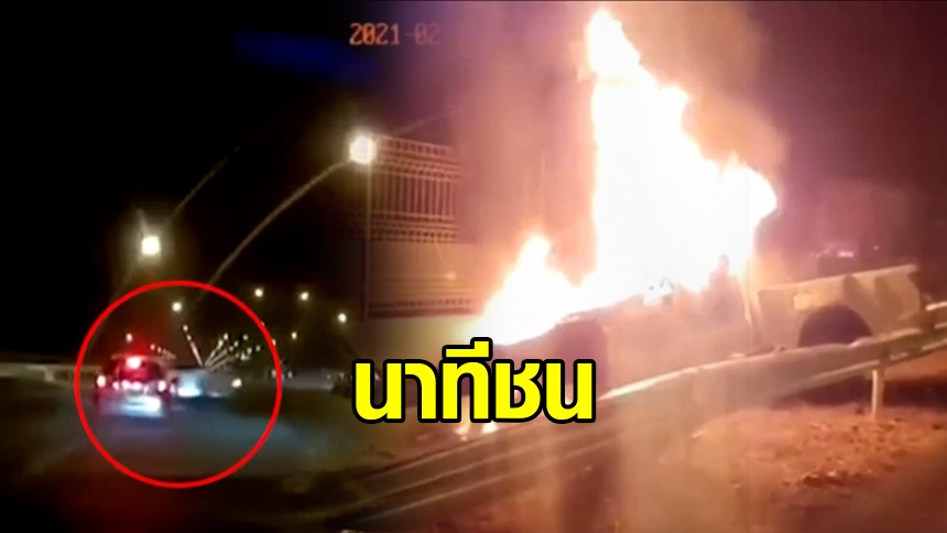 เปิดคลิปหนุ่มซิ่งกระบะ เสียหลักหมุนกลางมอเตอร์เวย์ ก่อนอัดริมถนนไฟลุกดับ 1