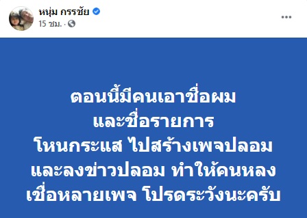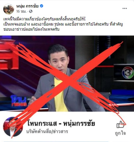 “เพจนี้ไม่มีความเกี่ยวข้องใดๆกับผมทั้งสิ้นนะครับเป็นเพจแอบอ้าง และเอาชื่อผม รูปผม และชื่อรายการไปใส่นะครับ ที่สำคัญชอบเอาข่าวปลอมไปลงในเพจครับ” ทำให้มีชาวเน็ตหลายคนเข้าไปคอมเมนต์แสดงความคิดเห็นกันอย่างต่อเนื่อง