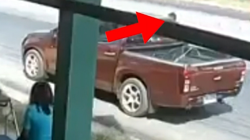 ภาพจากกล้องวงจรปิดจากหน้าร้านค้าแห่งหนึ่ง จับภาพชาวบ้าน5-6 คนยืนคุยกันตามปกติ ในภาพจะเห็นรถกระบะ คันสีแดงเลือดหมูจอดอยู่ริมถนน จู่ๆ มีชายเสื้อขาว ไม่รู้เดินมาจากไหน เปิดประตูขึ้นรถ แล้วขับออกไปต่อหน้าต่อตา ท่ามกลางชาวบ้านงง และวิ่งไล่ตามรถกระบะไปด้วยความตกใจ
