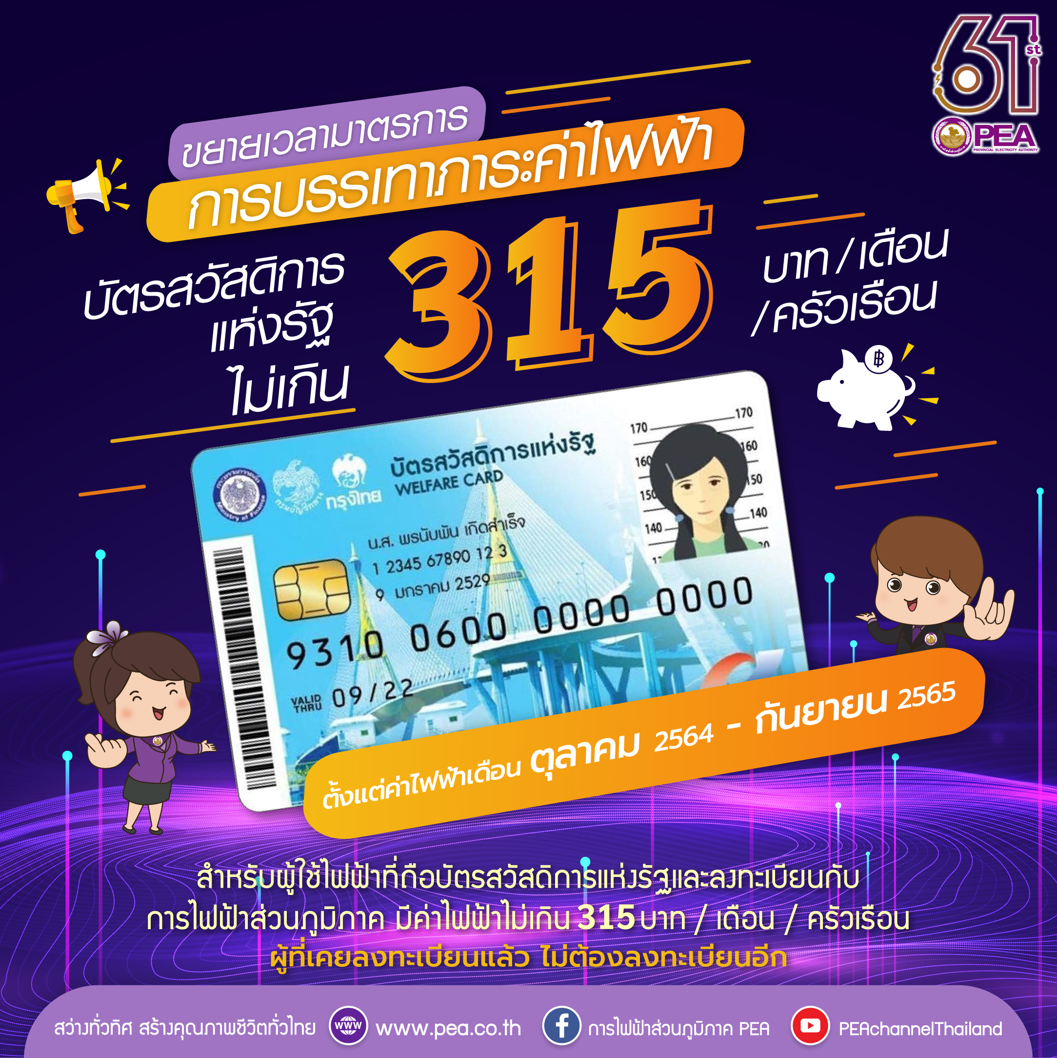 การไฟฟ้าส่วนภูมิภาค (PEA) มีมาตรการช่วยเหลือผู้ใช้ไฟฟ้าเพื่อบรรเทาค่าใช้จ่ายแก่ผู้มีบัตรสวัสดิการแห่งรัฐ 315 บาทต่อครัวเรือนต่อเดือน (1 ครัวเรือนใช้ได้เพียง 1 สิทธิ) กรณีใช้เกินวงเงินที่กำหนด ผู้มีบัตรฯ เป็นผู้รับภาระค่าไฟฟ้าทั้งหมด และหากใช้ไฟฟ้าไม่เกิน 50 หน่วยต่อเดือน ติดต่อกันเป็นระยะเวลา 3 เดือน ให้ใช้สิทธิค่าไฟฟ้าฟรีตามมาตรการที่มีอยู่ในปัจจุบัน