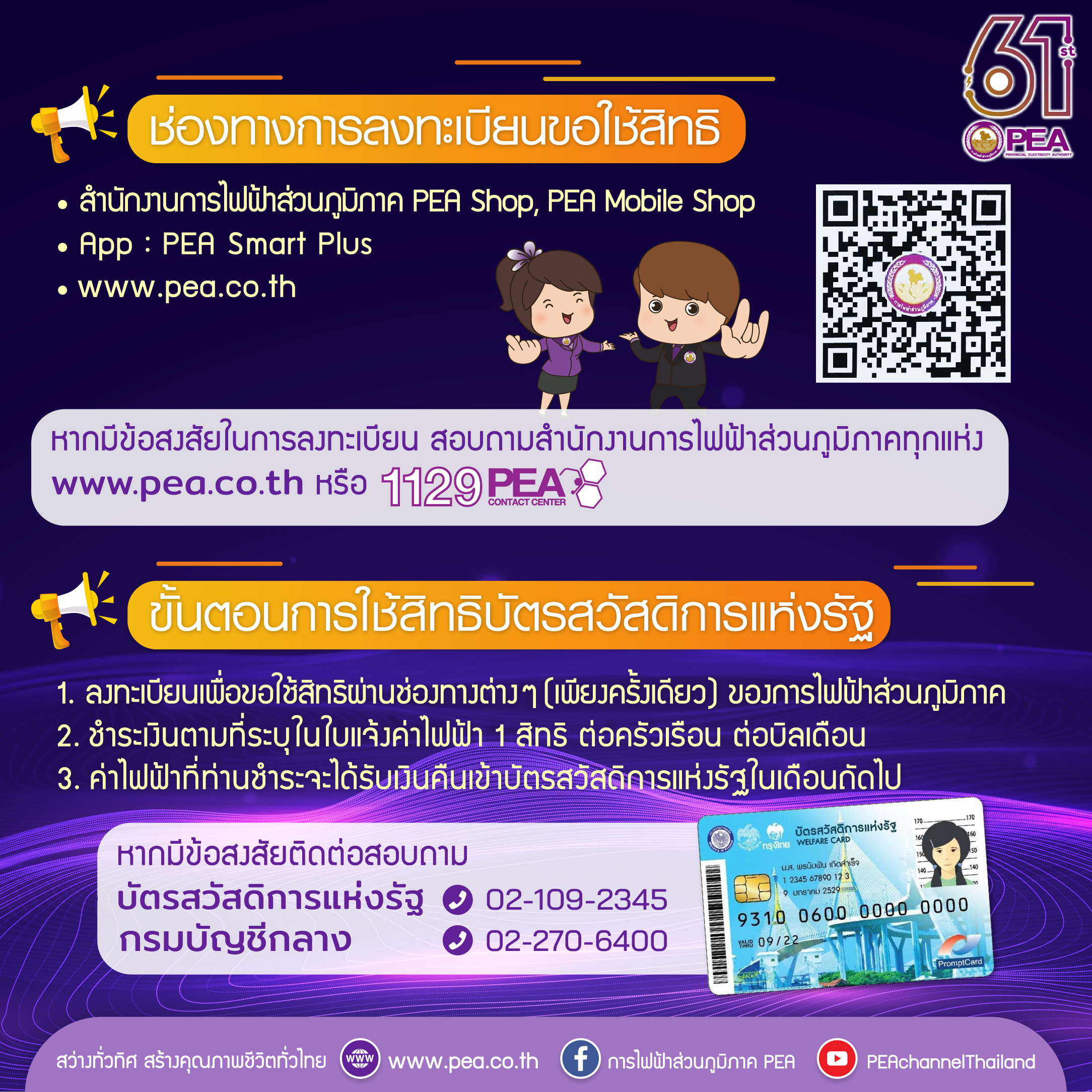 สำหรับผู้ที่มีบัตรฯ และประสงค์จะขอรับสิทธิ สามารถลงทะเบียน ขอรับสิทธิได้ที่ สำนักงานการไฟฟ้าส่วนภูมิภาค PEA Shop, PEA Mobile Shop, Application PEA Smart Plus และ www.pea.co.th หรือสอบถามข้อมูลเพิ่มเติมได้ที่ 1129 PEA Contact Center ตลอด 24 ชั่วโมง (ผู้ที่เคยลงทะเบียนแล้ว ไม่ต้องลงทะเบียนอีก)