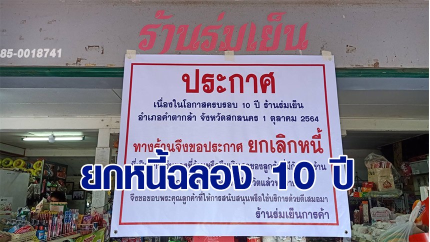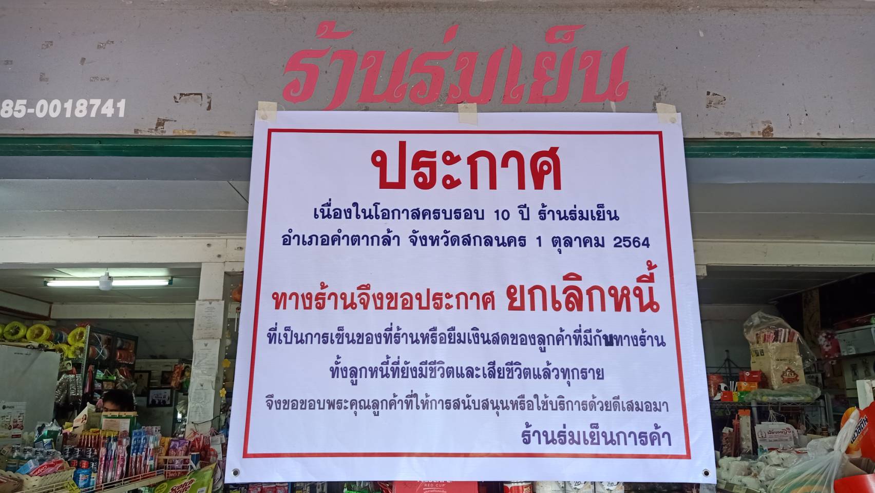 เป็นที่ฮือฮาของร้านขายของเบ็ดเตล็ด ใน อ.คำตากล้า จ.สกลนคร ที่ชื่อว่าร้านร่วมเย็ย ที่ได้ออกประกาศ เนื่องใน โอกาสครบรอบ 10 ปี ของร้าน เมื่อ 1 ตุลาคม 2564 ทางร้านจึงขอประกาศ ยกเลิกหนี้ ที่เป็นการเช็นของที่ร้าน หรือการยืมเงินสดของลูกค้า ที่มีกับทางร้านทั้งลูกหนี้ที่ยังมีชีวิต และเสียชีวิตแล้วทุกราย จึงขอขอบพระคุณลูกค้าที่ให้การสนับสนุนหรือใช้บริการด้วยดีเสมอมา ร้านร่มเย็นการค้า จนได้รับเสียงชื่นชมในโลกโซเชียลอยู่ในขณะนี้