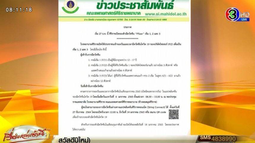 โรงพยาบาลศิริราชเปิดให้ประชาชนเข้าจองวันและเวลาฉีดวัคซีนโควิด 19 ของบริษัทไฟเซอร์ (PZ) เพื่อเป็นเข็ม 1, 2 และ 3 โดยมีเงื่อนไข ดังนี้