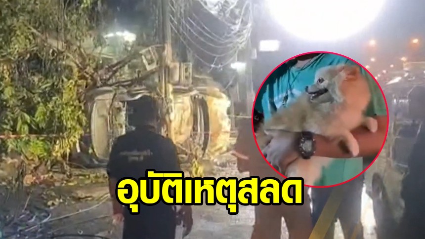 เก๋งชนอัดเสาไฟ เพลิงลุกไหม้คลอกทั้งคัน ดับ 2 ศพ น้องหมาวิ่งออกจากรถ รอดตายปาฏิหาริย์