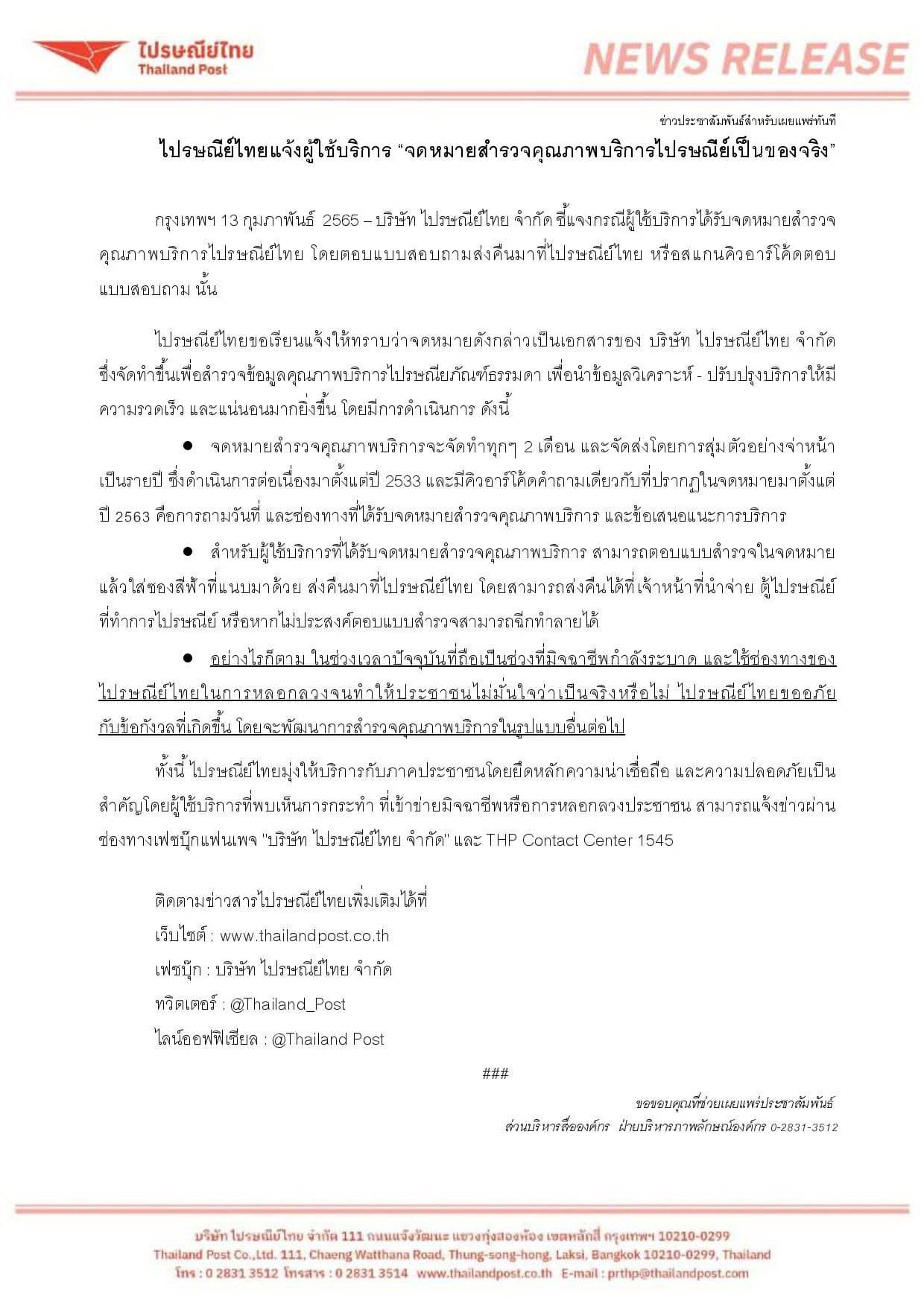 - อย่างไรก็ตาม ในช่วงเวลาปัจจุบันที่ถือเป็นช่วงที่มิจฉาชีพกำลังระบาด และใช้ช่องทางของไปรษณีย์ไทยในการหลอกลวงจนทำให้ประชาชนไม่มั่นใจว่าเป็นจริงหรือไม่ ไปรษณีย์ไทยขออภัยกับข้อกังวลที่เกิดขึ้น โดยจะพัฒนาการสำรวจคุณภาพบริการในรูปแบบอื่นต่อไป