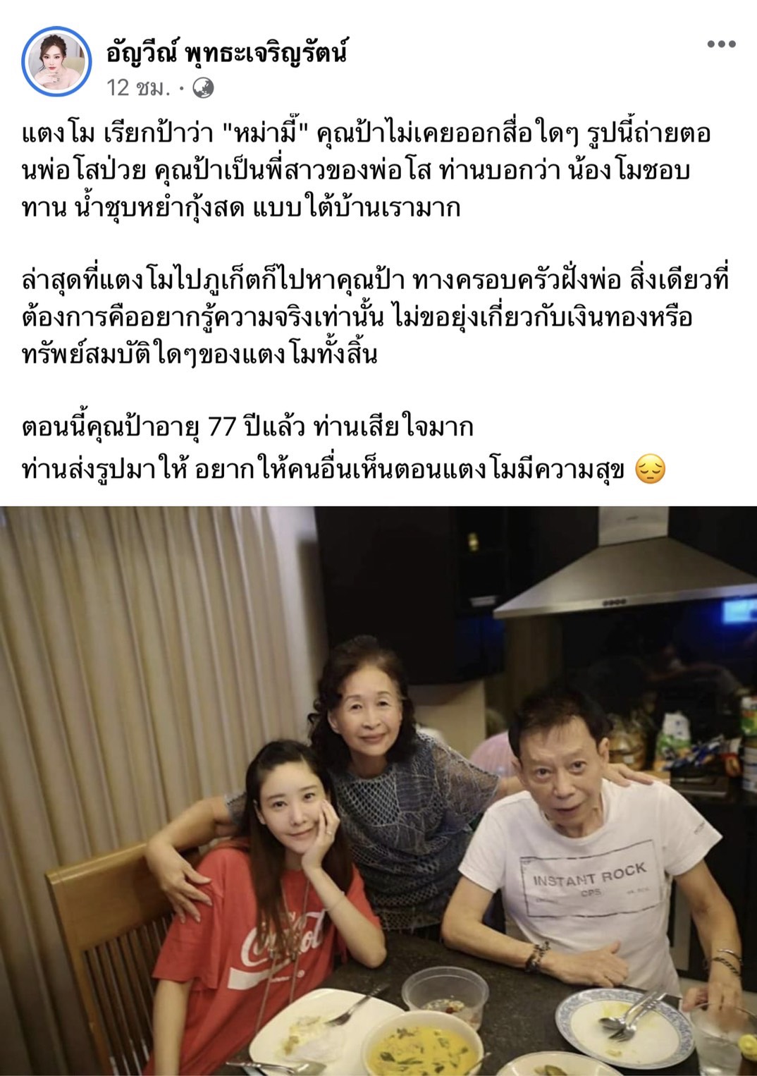 เจ้าของเฟซบุ๊ก ระบุว่า แตงโม เรียกป้าว่า "หม่ามี๊" คุณป้าไม่เคยออกสื่อใดๆ รูปนี้ถ่ายตอนพ่อโสป่วย คุณป้าเป็นพี่สาวของพ่อโส ท่านบอกว่า น้องโมชอบทาน น้ำชุบหยำกุ้งสด แบบใต้บ้านเรามาก