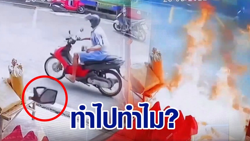 ชายขี่ จยย.ผ่านหน้าร้านเขียงหมูเจ๊เพ็ญหมูสด ก่อนโยนแกลลอนน้ำมันที่จุดติดไฟไว้แล้วโยนเข้ามาในร้าน จนเกิดไฟไหม้ โชคดีดับไฟทันไม่ลุกลาม เจ้าของร้านยันไม่เคยมีเรื่องกับใคร