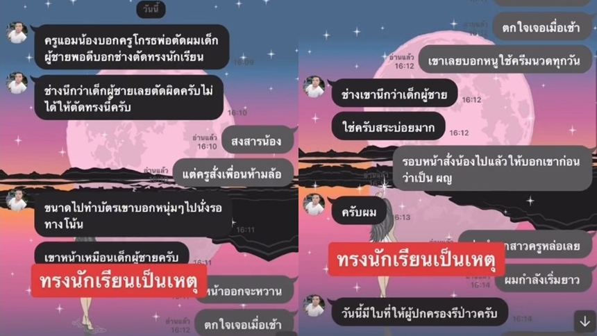 ต่อมา คุณครูได้แชร์ภาพบทสนทนาระหว่างผู้ปกครองของน้องนักเรียนหญิง โดยคุณพ่ออธิบายว่า “ช่างนึกว่าเด็กผู้ชายเลยตัดผิดครับ ไม่ได้ให้ตัดทรงนี้ครับ ขนาดไปทำบัตรเขาบอกหนุ่มๆ ไปนั่งรอทางโน้น เขาหน้าเหมือนเด็กผู้ชายครับ”