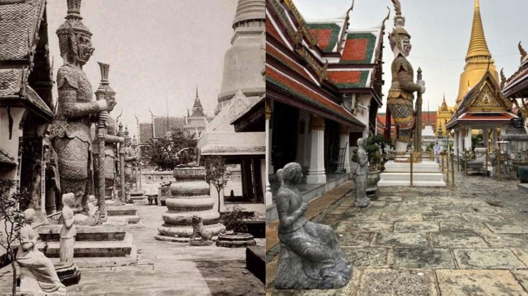 จากการสืบค้นข้อมูลทางประวัติศาสตร์ในเบื้องต้นพบว่า ประติมากรรมหินหลักเหล่านี้ปรากฏในภาพถ่ายเก่าในรัชสมัยพระบาทสมเด็จพระจอมเกล้าเจ้าอยู่หัวประดับตกแต่งอยู่โดยรอบพระอารามและมีการโยกย้ายในรัชสมัยต่อๆ กันมา ซึ่งมีหลักฐานจากภาพที่ตีพิมพ์ในหนังสือทั้งในประเทศและต่างประเทศ พระบาทสมเด็จพระเจ้าอยู่หัวทรงพระกรุณาโปรดเกล้าฯ ให้ทำการอนุรักษ์ซ่อมแซมประติมากรรมหินสลัก และนำมาประดับในวัดพระศรีรัตนศาสดารามบริเวณตำแหน่งเดิมหรือใกล้เคียง”