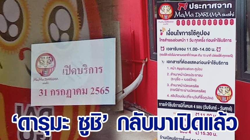 ซึ่งภาพที่ถูกโพสต์เป็นภาพหน้าร้าน 'ดารุมะ ซูชิ' ที่เปลี่ยนชื่อใหม่เป็น 'มาม่า ดารุมะ' พร้อมกับติดป้ายประกาศ 'เปิดให้บริการ 31 กรกฎาคม 2565' ท่ามกลางชาวเน็ตที่คอมเมนต์ถามหาว่าสาขาไหน และ กลับมาเปิดใหม่จริงหรือ?