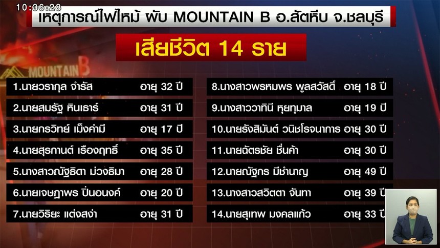ส่วน ที่สถาบันนิติเวชวิทยา โรงพยาบาลตำรวจ รถมูลนิธิสว่างโรจนธรรมสถาน สัตหีบ จำนวน 5 คัน เคลื่อนร่างของผู้เสียชีวิตจากเหตุเพลิงไหม้ผับเม้าท์เท่น บี ริมถนนสาย สุขุมวิทบางนา-ตราด ม.7 ต.พลูตาหลวง อ.สัตหีบ จ.ชลบุรี เมื่อเวลา 0.45 น. ที่ผ่านมา จำนวน 13 ศพ แบ่งเป็นชาย 9 ศพ และ หญิง 4 ศพ มาส่งชันสูตรพลิกศพ และ ผ่าพิสูจน์เอกลักษณ์บุคคล