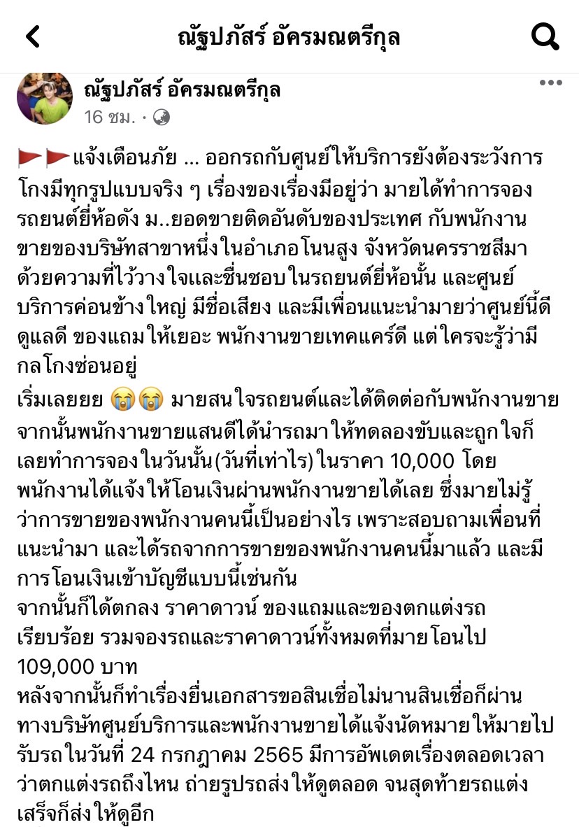 ผู้ใช้บัญชีเฟซบุ๊ก ณัฐปภัสร์ อัครมณตรีกุล โพสต์แจ้งเตือนภัย ระบุว่า ออกรถกับศูนย์ให้บริการยังต้องระวังการโกงมีทุกรูปแบบจริง ๆ เรื่องของเรื่องมีอยู่ว่า เจ้าของโพสต์ได้ทำการจองรถยนต์ยี่ห้อดัง ม... ยอดขายติดอันดับของประเทศ กับพนักงานขายของบริษัทสาขาหนึ่งใน อ.โนนสูง จ.นครราชสีมา ด้วยความที่ไว้วางใจเเละชื่นชอบในรถยนต์ยี่ห้อนั้น และศูนย์บริการค่อนข้างใหญ่ มีชื่อเสียง และมีเพื่อนแนะนำมายว่าศูนย์นี้ดี ดูแลดี ของแถมให้เยอะ พนักงานขายเทคแคร์ดี แต่ใครจะรู้ว่ามีกลโกงซ่อนอยู่