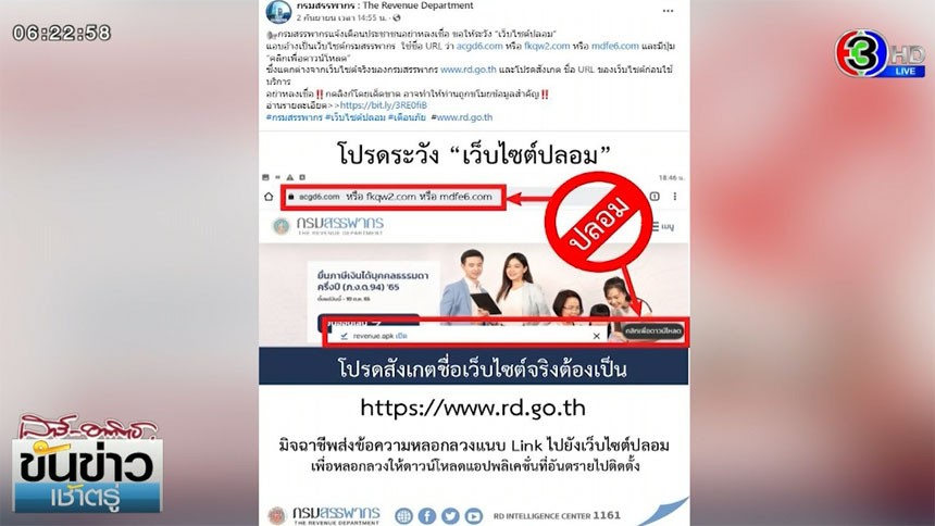 'กรมสรรพากร' เตือนระวังมิจฉาชีพ หลอกคืนเงินภาษี ลวงกรอกข้อมูลเว็บไซต์ปลอม