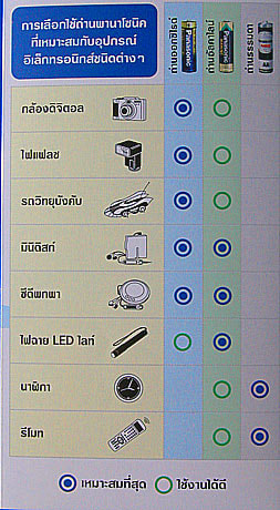 ดูจากตารางการถ่านพานาโซนิกเค้าก็จะเเนะนำการใช้ถ่านกับอุปกรณ์ต่างๆเพื่อความเหมาะสมเราก็ได้ความรู้มากขึ้น