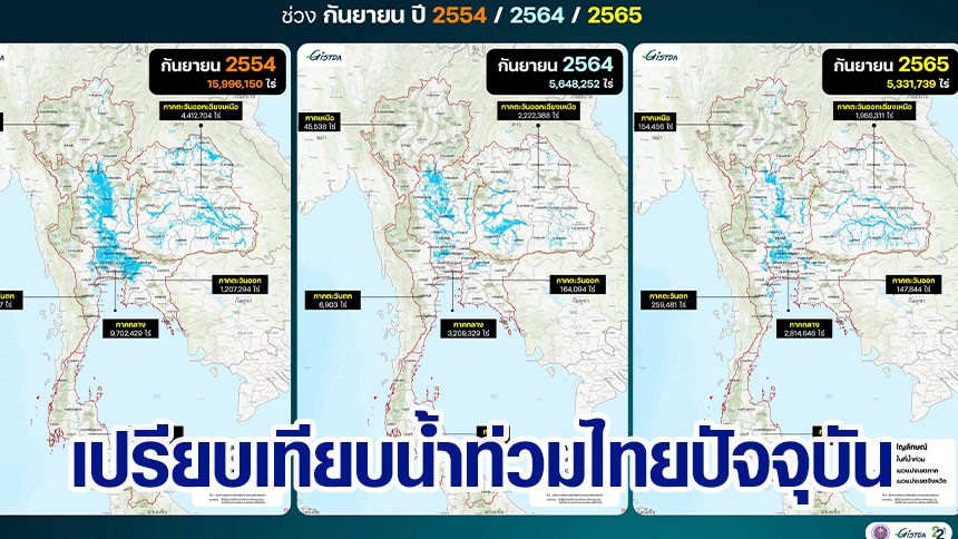 GISTDA เปิดเผยข้อมูลภาพจากดาวเทียมแสดงสถานการณ์น้ำท่วมของเดือนกันยายนปี 2554 2564 และ 2565 พบว่าปี 2554 มีปริมาณน้ำท่วมขังทั่วประเทศ จำนวน 15,996,150 ไร่ ปี 2564 จำนวน 5,648,252 ไร่ และในปี 2565 (ล่าสุด) พบพื้นที่น้ำท่วมขังจำนวน 5,331,739 ไร่ ดังนั้น เมื่อเปรียบเทียบกับปี 2554 พบว่าปริมาณน้ำท่วมขังในปัจจุบันยังห่างอยู่ 3 เท่าตัว