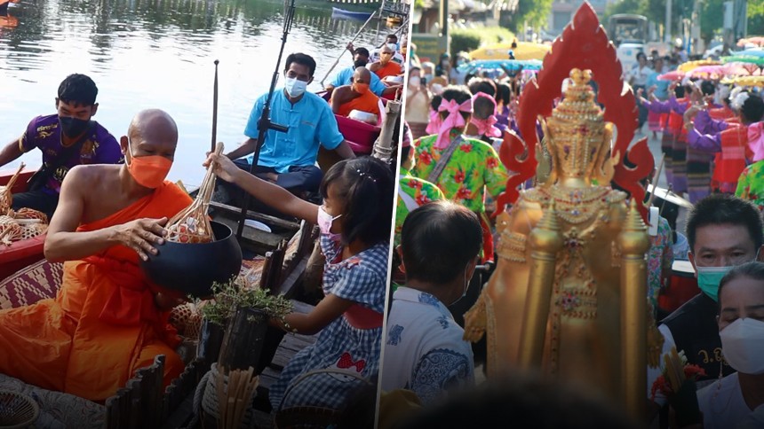 โดยทางวัดได้ทำการตกแต่งเรือ เพื่ออัญเชิญพระพุทธรูป ลงเรือเพื่อให้ประชาชนได้ร่วมทำบุญ ท่ามกลาง เสียงของกลองยาว ของชมรมกลองยาวผู้สูงอายุ ตำบลดงกลาง ที่ลงเรือบรรเลงเพลง ตลอดของลำคลอง ให้ประชาชนได้ร่วมทำบุญตักบาตร กับพระสงฆ์จำนวน 9 รูป นั่งเรือผ่านหน้าแพไม้ไผ่ ที่สร้างเป็นแถวยาวต่อกันไปตลอดของลำคลอง