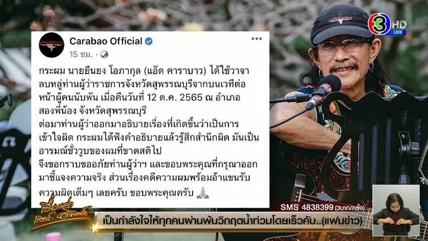 ขณะที่วานนี้ (15 ต.ค.) เพจ Carabao Official ได้โพสต์คำขอโทษของ ‘แอ๊ด คาราบาว’ โดยระบุว่า