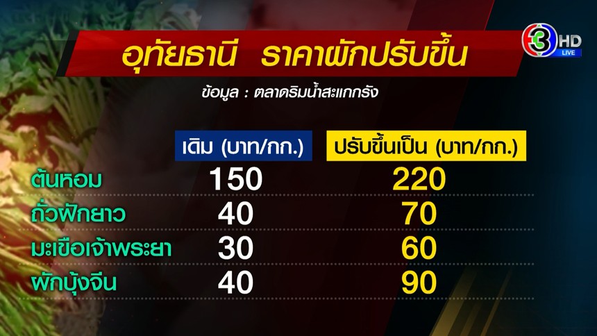 ขณะนี้ราคาผักสดเกือบทุกชนิดขยับราคาแพงขึ้นมากเกือบทุกชนิด เช่นต้นหอมจากราคากิโลกรัมละ 150 บาท ขึ้นเป็นกิโลกรัมละ 220 บาท ถั่วฝักยาวจากกิโลกรัมละ 40 ขึ้นเป็นกิโลกรัมละ 70 บาท มะเขือเจ้าพระยาจากกิโลกัมละ 30 บาท ขึ้นเป็นกิโลกรัมละ 60 บาท และผักบุ้งจีนจากราคากิโลกรัมละ 40 บาท ขึ้นเป็นกิโลกรัมละ 90 บาท เป็นต้น
