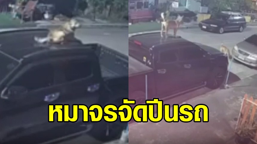 เกิดขึ้นเมื่อเช้าตรู่ของวันที่ 15 ธันวาคม ที่ผ่านมา จับภาพเจ้าสุนัขสีน้ำตาลกระโดดขึ้นมาที่หน้ากระโปรงรถกระบะของตนเองที่จอดเอาไว้หน้าบ้านพัก โดยมีสุนัขอีกตัวที่อยู่ด้านล่างวิ่งไล่หยอกล้อ พยายามจะหาทางกระโดดตามขึ้นไป ก่อนที่เจ้าสุนัขที่อยู่บนรถ จะกระโดดลงมาวิ่งขึ้นไปบนรถเก๋งที่จอดอยู่ภายในซอยเดียวกันอีก จนกระทั่งตอนเช้าได้ออกมาตรวจดูรอบๆ รถ เห็นมีรอยขีดข่วนที่รถกระบะคันโปรดรอบคัน สีรถได้รับความเสียหาย ทั้งช่วงกระโปรงหน้า หลังคารถ