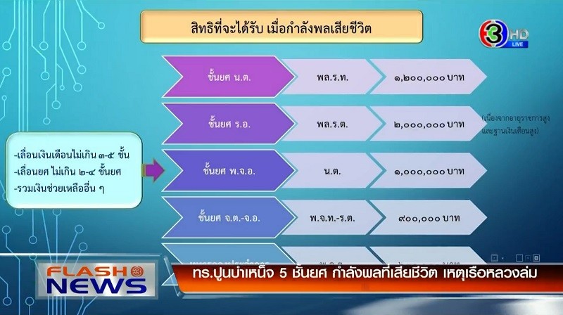 โฆษกกองทัพเรือเผย กำลังพลที่เสียชีวิต จากเหตุเรือหลวงสุโขทัยอับปาง จะได้รับการปูนบำเหน็จ 5 ชั้นยศ และได้รับเงินชดเชยตามระเบียบราชการ 1-2 ล้านบาท ตามสิทธิของแต่ละบุคคล ส่วนการค้นหากำลังพลอีก 23 นาย วันนี้จะเน้นไปทางทิศตะวันตกเฉียงใต้ ในระยะ 40 ไมล์ทะเลจากจุดเรือจม