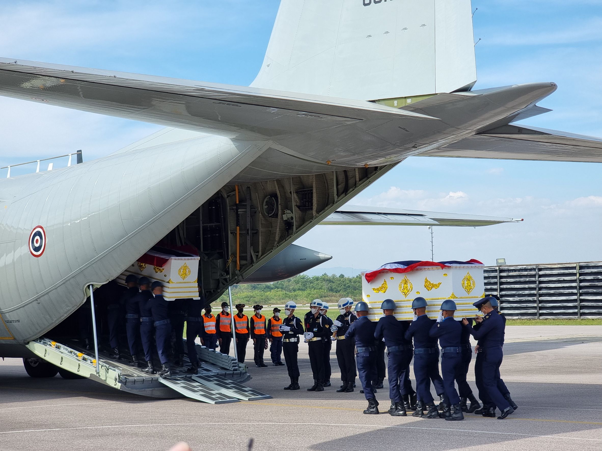 ทันทีที่มาถึงกองบิน 5 เจ้าหน้าที่ช่วยกันลำเลียงร่างกำลังพลทั้ง 6 ร่างภายในโลงไม้ลงจากรถมูลนิธิฯ จากนั้นได้นำธงชาติไทยมาคลุมไว้ด้านบนโลงศพและรูปถ่ายของกำลังพลมาวางหน้าโลง