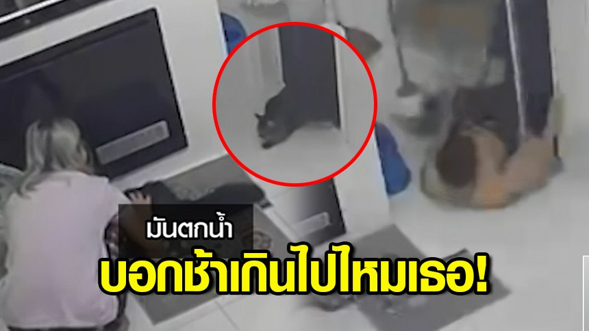 โดยในคลิปจะเห็นว่า มีแมววิ่งทะลุประตู ก่อนจะวิ่งกลับเข้ามาในบ้าน ซึ่งเจ้าของถึงกับตะโกนว่า “เฮีย ไออ้วนมันทะลุประตูออกไป มันตกน้ำ” ทั้งยังกรี๊ดออกมา
