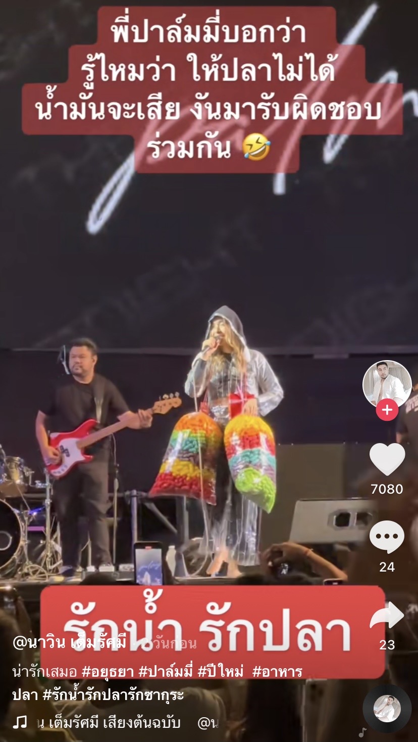 แต่งานนี้ทำเอาแฟน ๆ ปรบมือกับสาวปาล์มมี่กันไม่หยุด เพราะนอกจากจะร้องเพลงแล้ว ยังได้ให้ความรู้ว่า ขนมเหล่านี้ถ้าโยนให้ปลาในแหล่งน้ำ จะทำให้น้ำเสียและทำลายสิ่งแวดล้อม โดยผู้โพสต์คลิป Tiktok ชื่อ นาวิน เต็มรัศมี ระบุว่า “พี่ปาล์มมี่บอกว่า รู้ไหมว่าให้ปลาไม่ได้ น้ำมันจะเสีย งันมารับผิดชอบร่วมกัน” ทำเอาแฟนคลับ ตั้งฉายาใหม่ให้ว่า “ปาล์มมี่รักน้ำ รักปลา” ไปอีกหนึ่งชื่อ