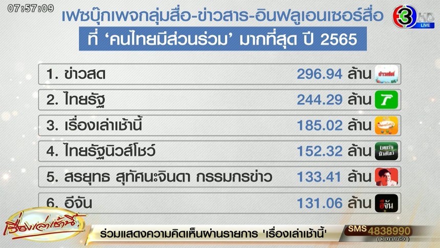 'เรื่องเล่าเช้านี้' - 'สรยุทธ กรรมกรข่าว' ติด TOP 10 สื่อที่คนไทยมีส่วนร่วมมากที่สุดปี 2565