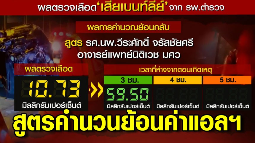 รศ.นพ.วีระศักดิ์ ได้แนะนำ สูตรงานวิจัยที่เป็นสากล สามารถคำนวณย้อนกลับปริมาณแอลกอฮอล์ ในเวลาเกิดเหตุจริงได้ โดยได้นำผลแอลกอฮอล์ 10.73 มิลลิกรัมเปอร์เซ็นต์ มาคำนวณในสูตรนี้ให้ทีมข่าว