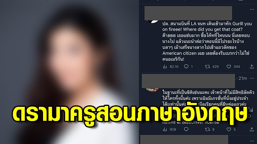 ดรามาครูสอนภาษาอังกฤษชื่อดัง หลังโพสต์ข้อความปล่อยโป๊ะในแอคเคาท์ทวิตเตอร์ เล่าถึงการใช้ภาษาอังกฤษในการใช้สิทธิพิเศษในต่างแดน โดยเธอเล่าว่า "ปล.สนามบิน LA จนท. เดินเข้ามาทัก Gurlll you on fireee! where did you get that coat? ต๊าย เธอแซ่บมาก ซื้อโค้ทที่ไหน นี่เลยตอบนางไป แล้วแนะนำต่อว่าตอนนี้มีโปรอะไรบ้าง บลาๆ เม้าเสร็จนางลากไปเข้าแถวลัดของ American citizen เฉย