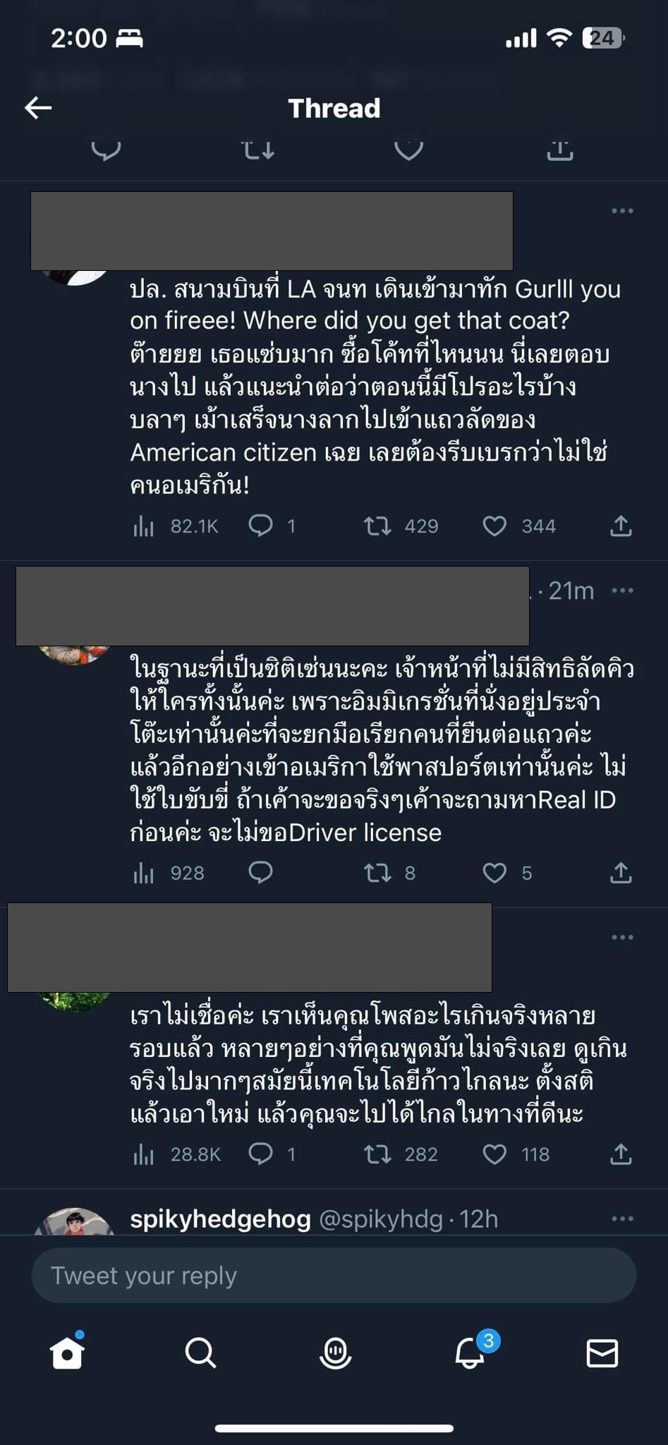 หลังจากนั้นมีผู้ใช้ทวิตเตอร์เข้ามาแสดงความคิดเห็นต่อจากโพสต์นี้ว่า "ในฐานะที่เป็นซิติเซ่นนะคะ เจ้าหน้าที่ไม่มีสิทธิลัดคิวให้ใครทั้งนั้นค่ะ เพราะอิมมิเกรชันที่นั่งอยู่ประจำโต๊ะเท่านั้นค่ะที่จะยกมือเรียกคนที่ยืนต่อแถวค่ะแล้วอีกอย่างเข้าอเมริกาใช้พาสปอร์ตเท่านั้นค่ะ ไม่ใช้ใบขับขี่ ถ้าเขาจะขอจริงๆเขาจะถามหา Real ID ก่อนค่ะ จะไม่ขอ Driver license
